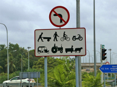 - 高速道路入口の看板。「手押し車、歩行者、自転車、バイク、スリーウィーラー、トラクター、牛の引く車は進入禁止」です。