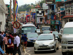 - 街の雑踏の様子。ここは中部の大都市 キャンディKandyの朝の様子。こんなところを運転するなんて・・・と思いますが、運転する側とすれば単なる渋滞なので運転上の心配はありません。