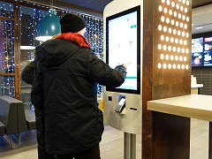 - オーダーの方法が先進的です。大型液晶TVを縦にした巨大ディスプレイがタッチパネルになっていて、その機械でオーダーします。支払いは下部のクレジットカードリーダーに差し込み、暗証番号を押すだけ。手渡し時の現金決済も選べます。