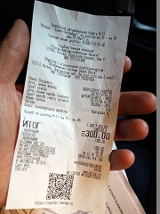 - タッチパネルは多言語選択式だったのですが、レシートは当然ロシア語のみ。価格は20%の間接税を含んでRUB252(ロシアルーブル)